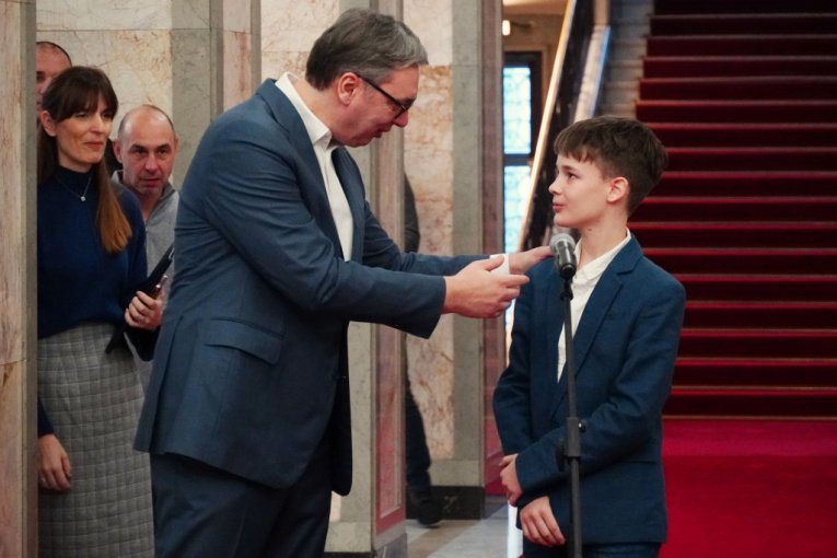 Dečak iz Rumunije, koji se nalazi u poseti Beogradu, zahvalio se predsedniku na brizi za sve, i potom su mu predali poklon.