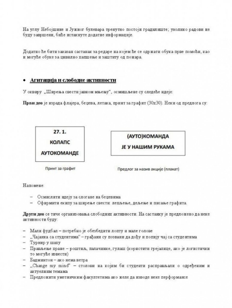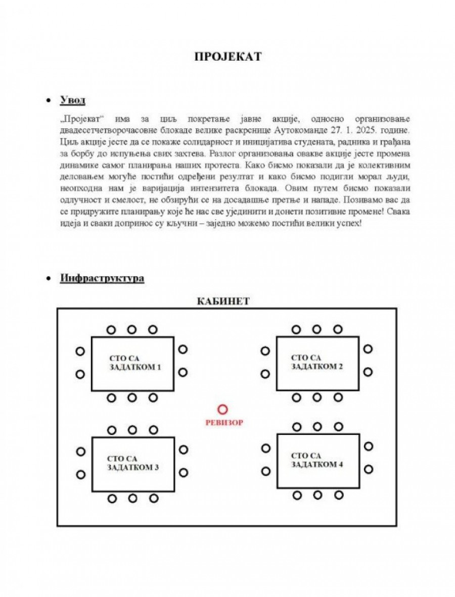 To nedvosmileno dokazuje dokument "Projekat" na 14 stranica predstavljen studentskom plenumu, u kojem se do detalja razrađuje akcija blokade raskrsnice na Autokomandi u Beogradu, zakazana za 27. januar u trajanju od 24 sata.