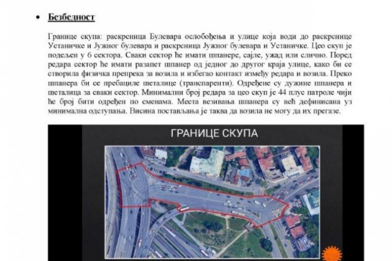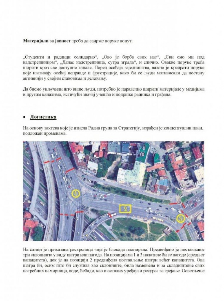 U tom dokumentu isplaniran je svaki minut tokom celodnevne blokade jednog od najvažnijih i najvećih saobraćajnih čvorišta glavnog grada - detaljno su razrađeni pravci dolaska, najpogodniji punktove za postavljanje "živih štitova", raznolika oprema za blokadu i višesatni boravak na hladnoći do sitnica poput šatora i grejalica, kao i potrebna prateća opremu za brendiranje akcije poput plakata, banera, bedževa...