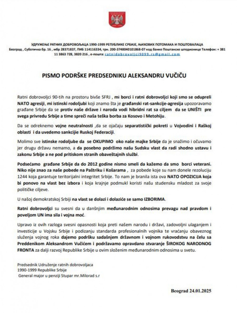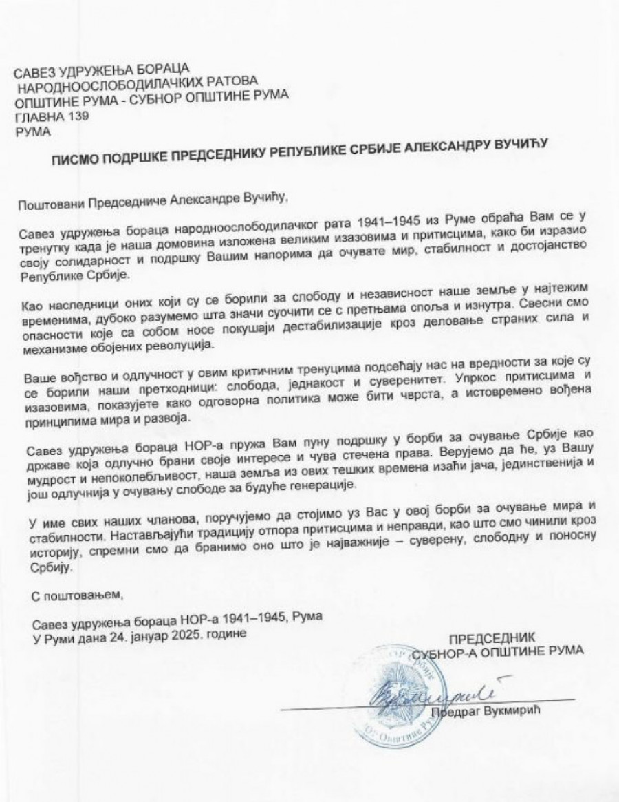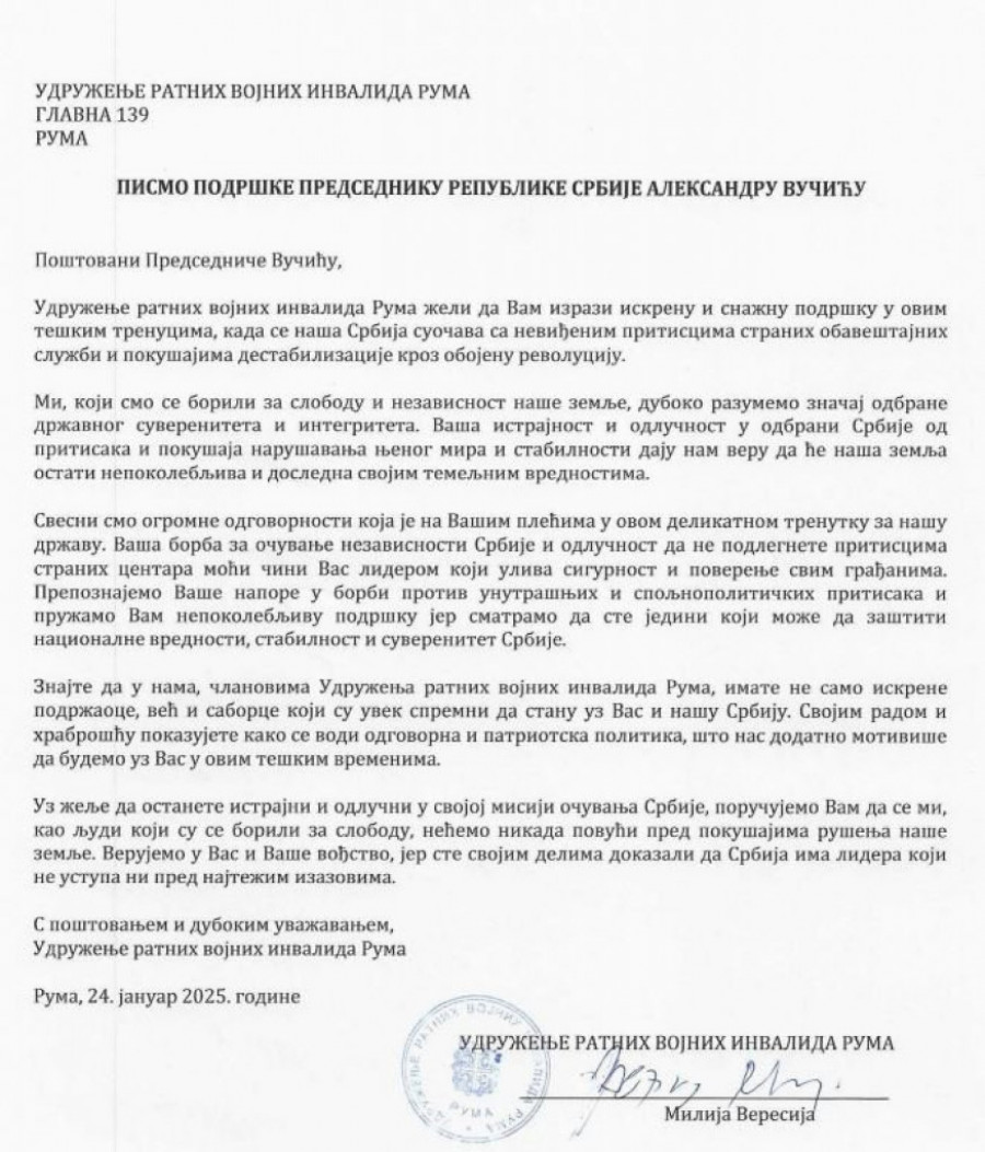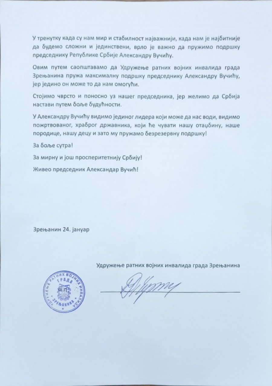 Udruženja ratnih vojnih invalida iz Zrenjanina i Rume, kao i Ratni dobrovoljci 90-tih na prostoru bivše SFRJ izrazili su punu podršku predsedniku Vučiću u borbi za očuvanje mira i stabilnosti Srbije. U saopštenjima se navodi da mudra politika predsednika Vučića čini Srbiju sinonimom za mir, što je od ključnog značaja u turbulentnim svetskim okolnostima.
