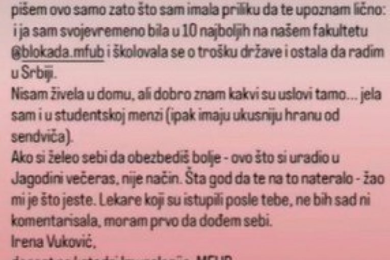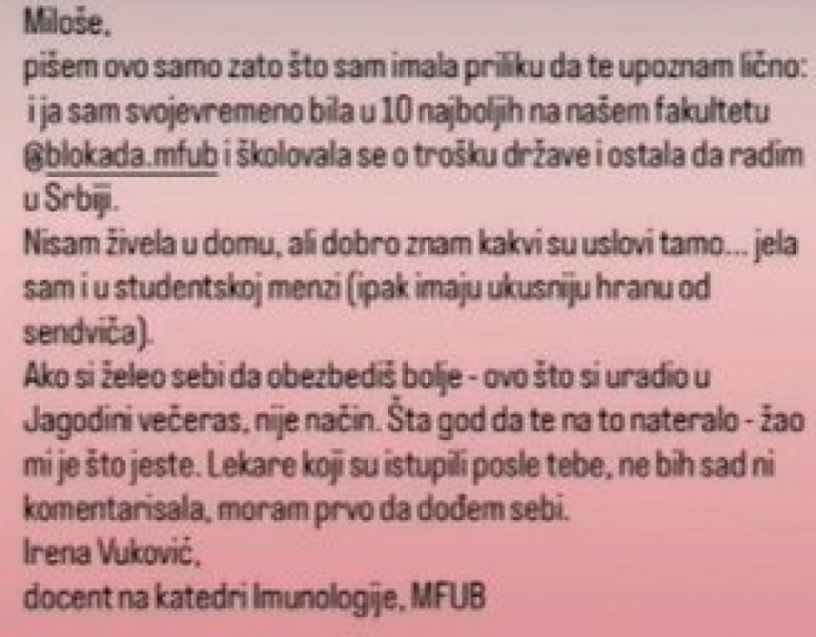 - Ako si želeo sebi da obezbediš bolje - ovo što si uradio u Jagodini večeras, nije način. Šta god da te na to nateralo - žao mi je što jeste. Lekare koji su stupili posle tebe, ne bih sad ni komentarisala, moram prvo da dođem sebi. Irena Vuković, docent na katedri Imunologije.