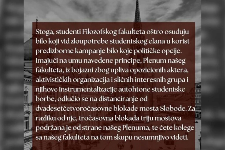 Plenum studenata Filozofskog fakulteta se najstrože ograđuje od pokušaja zloupotrebe studentskih blokada od strane bilo kojih političkih aktera u korist predizborne kampanje bilo koje političke opcije