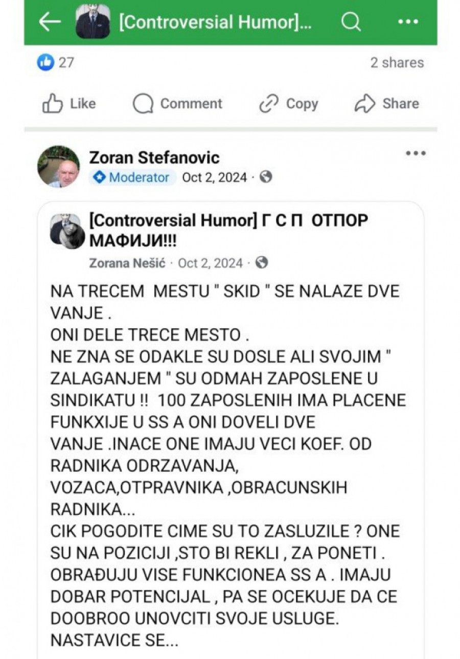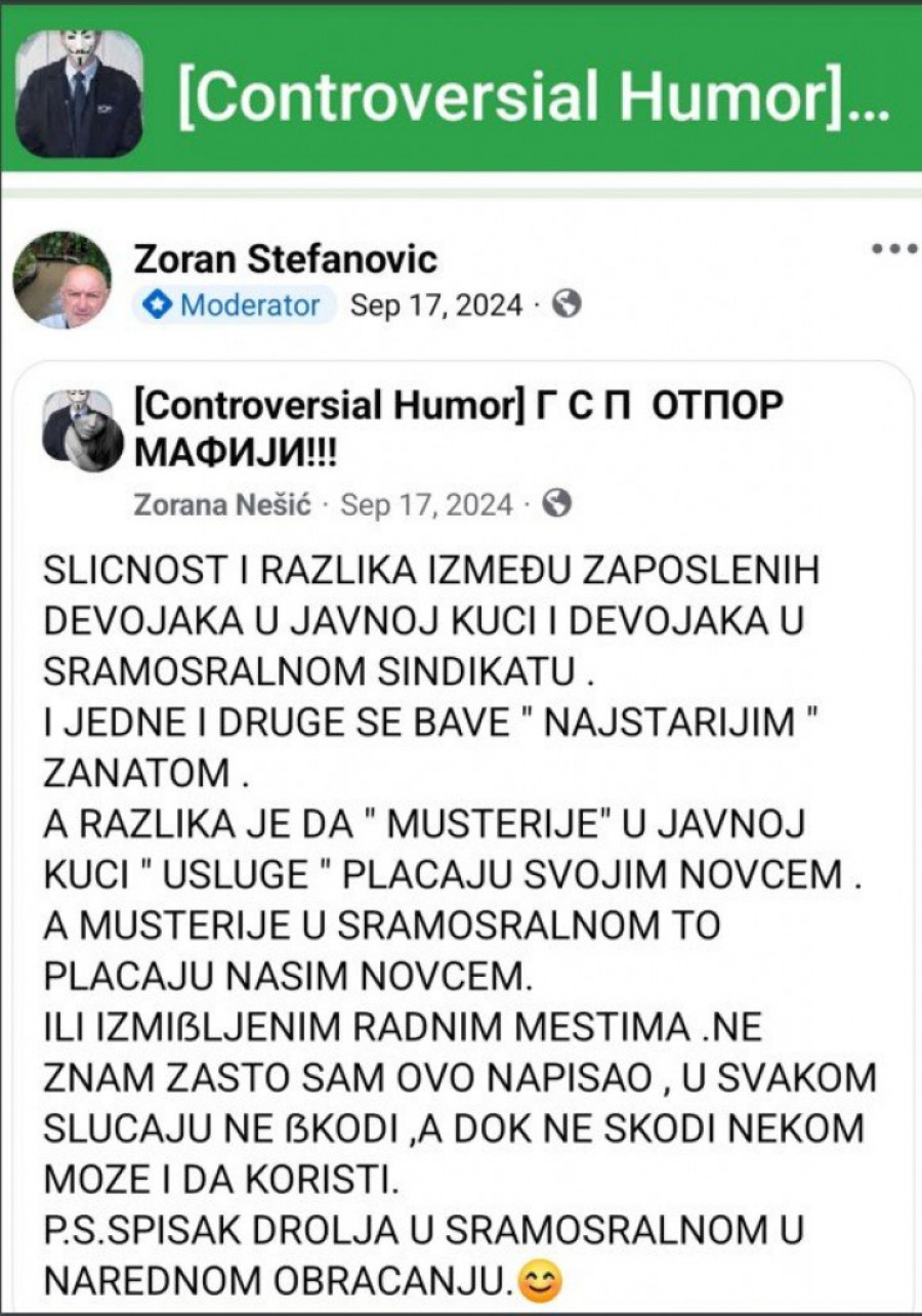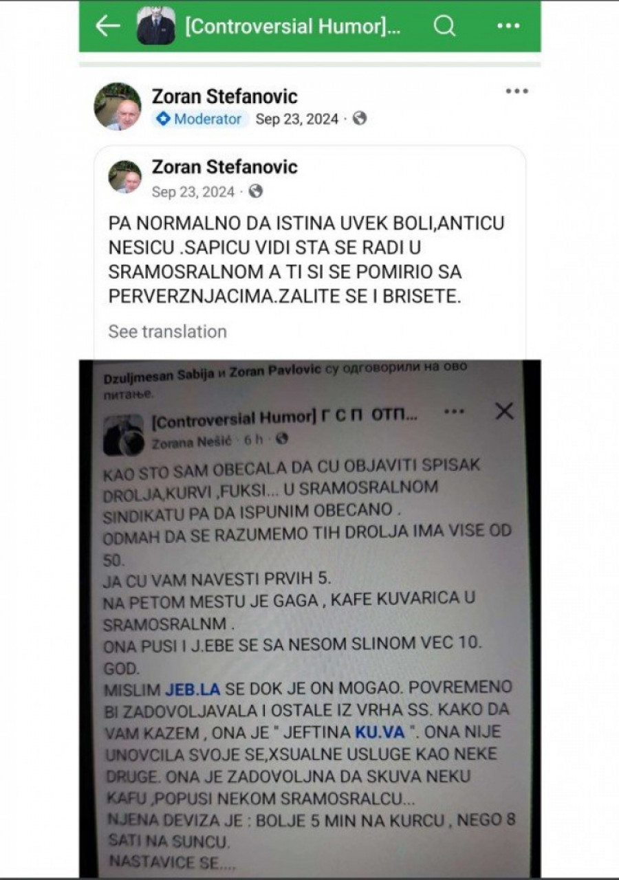 Međutim, ono što smatramo posebno zabrinjavajućim jeste činjenica da su pojedine koleginice bile izložene neprimerenim i uvredljivim komentarima sa seksualnim konotacijama. Stefanović nije obrisao nijedan od tih komentara, čime je doprineo dodatnoj uznemirenosti zaposlenih žena koje su pogođene ovim napadima.