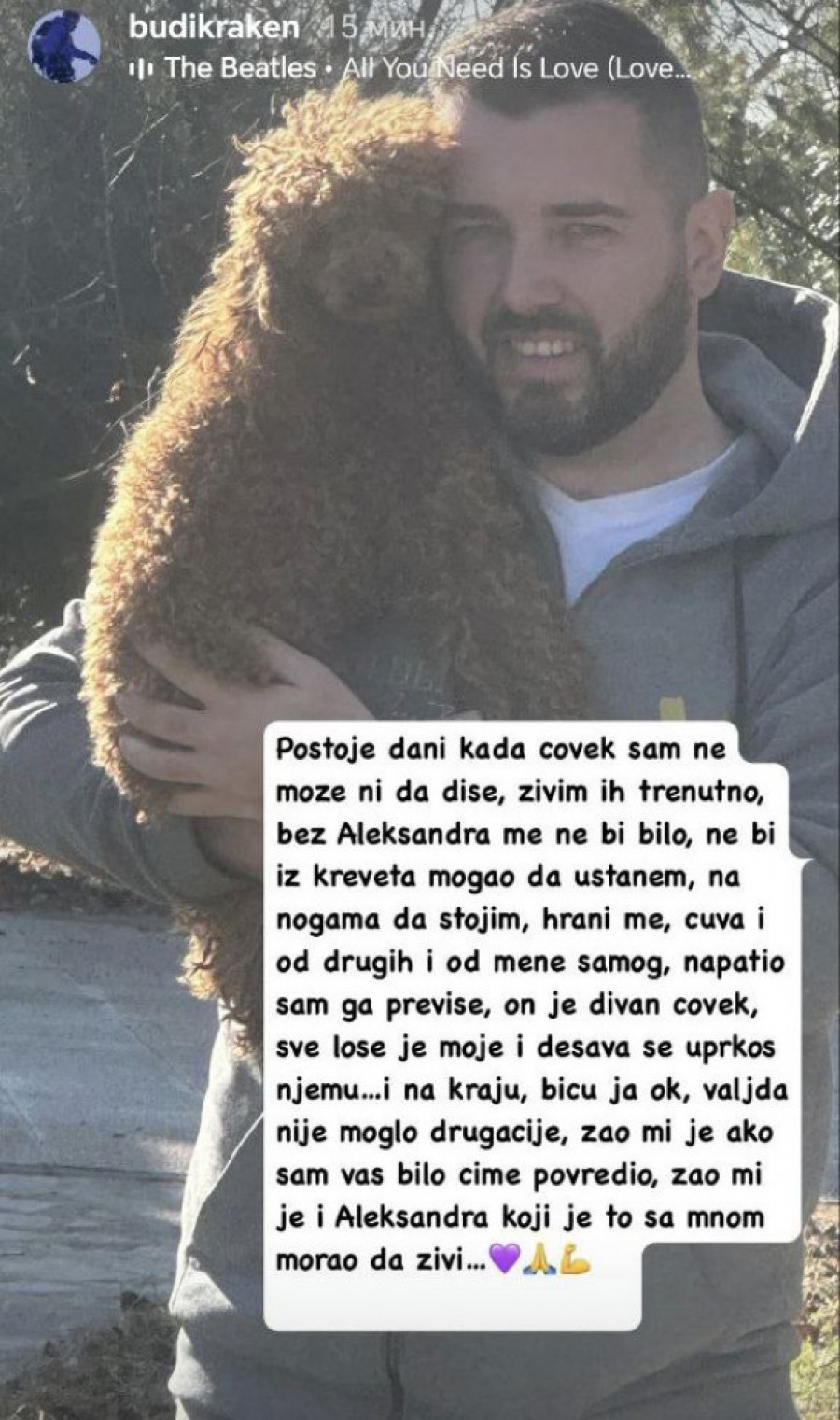- Postoje dani kada čovek ne može sam ni da diše, živim ih trenutno. Bez Aleksandra me ne bi bilo, ne bi iz kreveta mogao da ustanem, na nogama da stojim, hrani me, čuva i od drugih i od mene samog, napatio sam ga previše. On je divan čovek, sve loše je moje i dešava se uprkos njemu - piše u objavi Jovanovića.