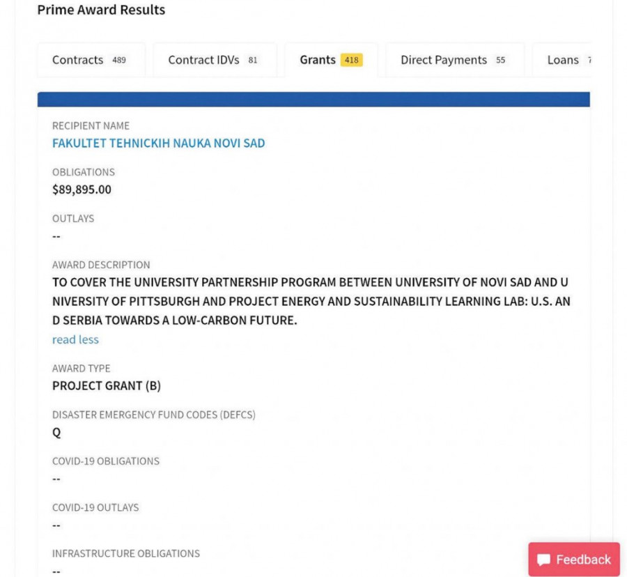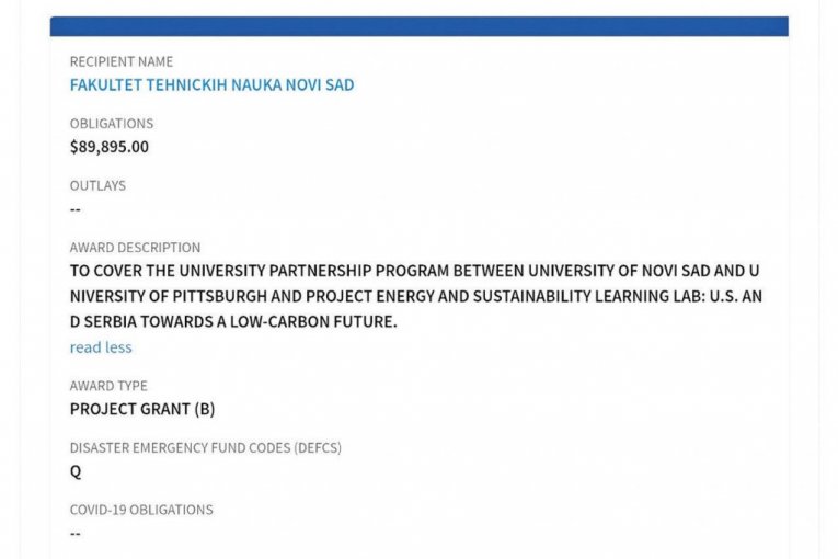 - Za Fakultet tehničkih nauka u Novom Sadu opredeljeno je 89.895 dolara, s početkom važenja od 13. februara ove godine. Taj novac predviđen je za program univerzitetskog partnerstva između Univerziteta u Novom Sadu i Univerziteta u Pitsburgu i projekat koji se odnosi na obuke/radionice o budućnosti s niskim emisijama ugljenika.