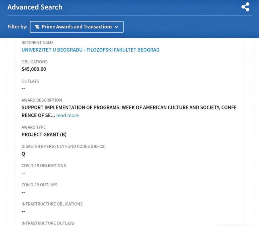 - Filozofski fakultet Univerziteta u Beogradu dobio je 45.000 dolara na ime podrške programu "Nedelja američke kulture", a projekat je počeo da teče 1. oktobra 2024, s rokom do 30. septembra 2025.