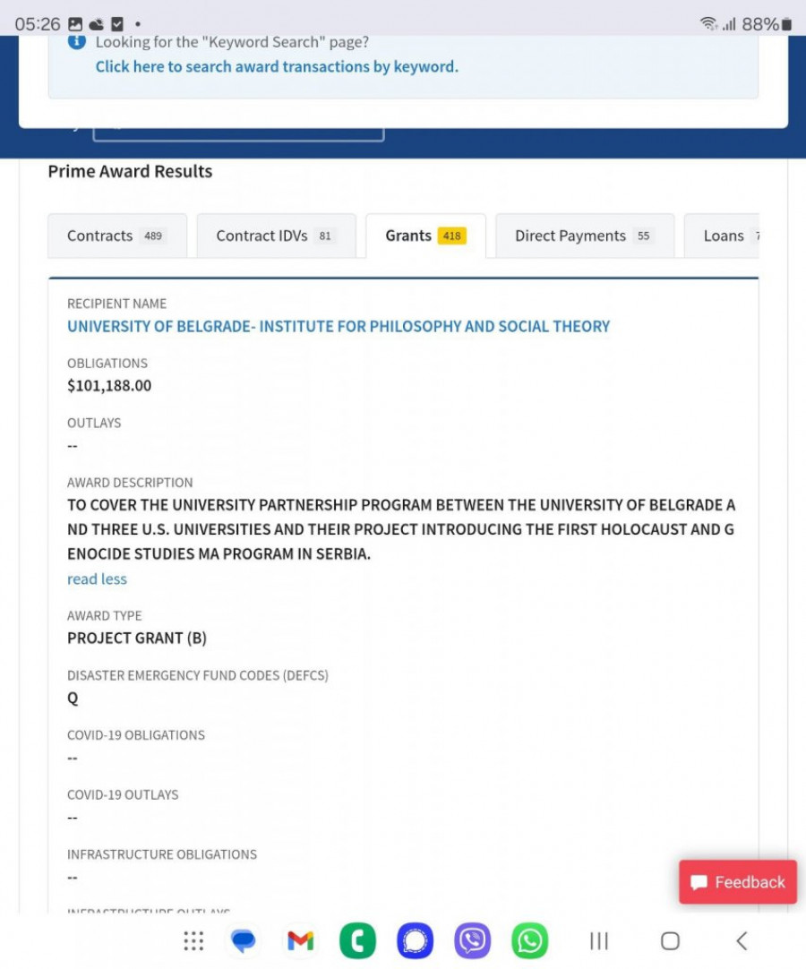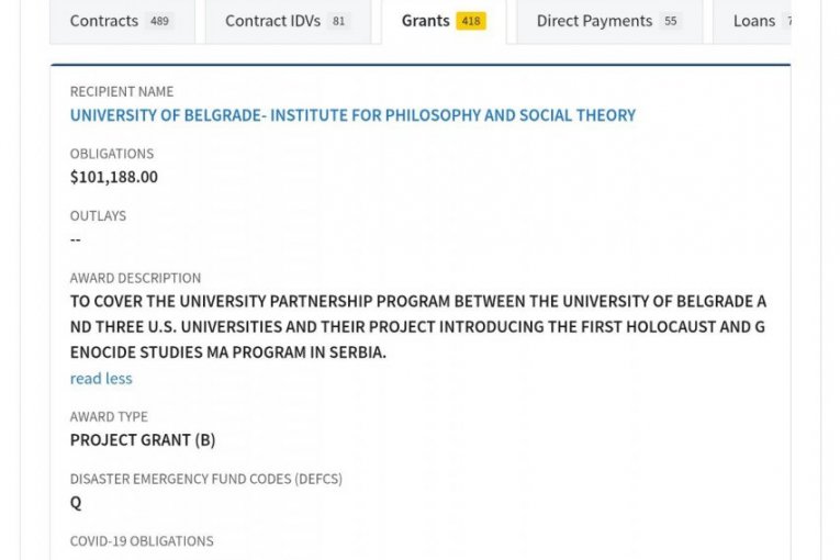 - Institutu za filozofiju i društvenu teoriju Univerziteta u Beogradu dodeljeno je 101.188 dolara za pokrivanje programa univerzitetskog partnerstva između Univerziteta u Beogradu i tri univerziteta u SAD na projektu uvođenja osnovnih studija holokausta i genocida u našoj zemlji. Tranše su, kako piše u američkim registrima, predviđene od kraja 2022. do 15. februara ove godine.