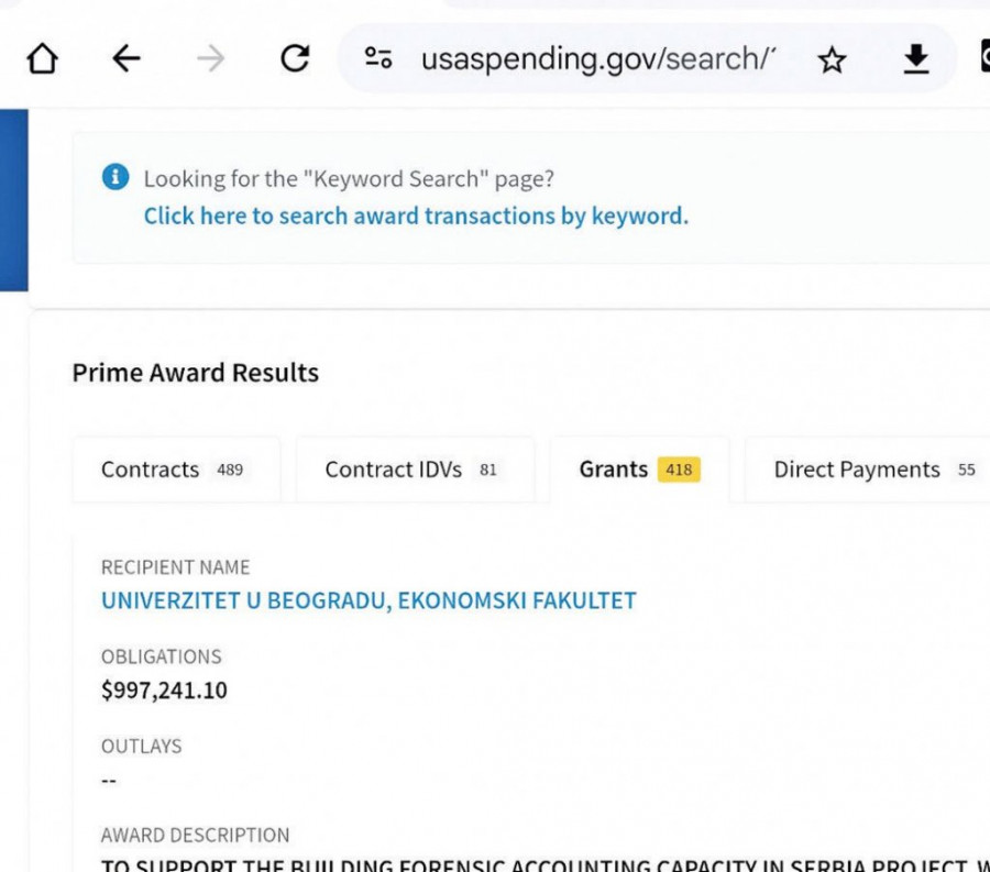 - Ekonomski fakultet u Beogradu, kako se navodi, ima pravo na 997.241 dolar od USAID, a projekat traje sve do 31. oktobra ove godine. Suština programa je podrška izgradnji kapaciteta za forenzičko računovodstvo u Srbiji, odnosno razvijanje i administriranje programa visokog obrazovanja za specijalizaciju u forenzičkom računovodstvu.