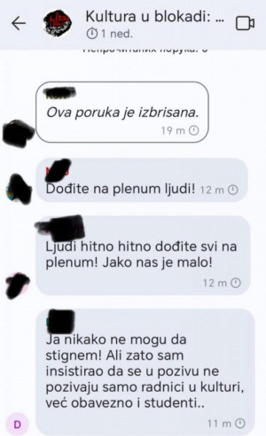 - Ljudi hitno, hitno dođite na plenum! Jako nas je malo - navodi se u prorukama "Kultura u blokadi".