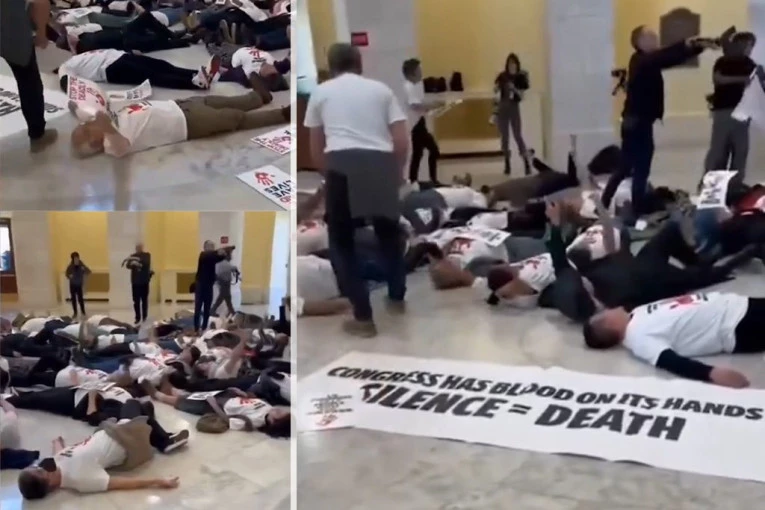 - Na jučerašnjem protestu na Kapitol hilu, u režiji nekadašnjih uposlenika USAID, kojima je Donald Tramp ukinuo finansiranje, održan je "performans", gde su se u belim majicama, s krvavim šakama, valjali po podu Kapitola!