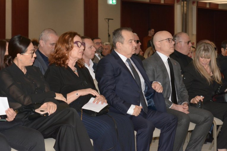 Na komemoraciji u Sava Centru, sede odmah pored Popovićeve udovice Suzane Jovanović.
