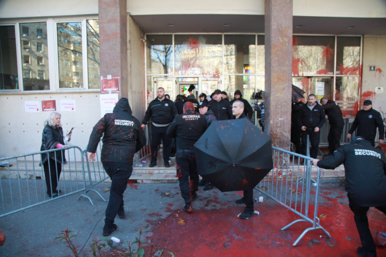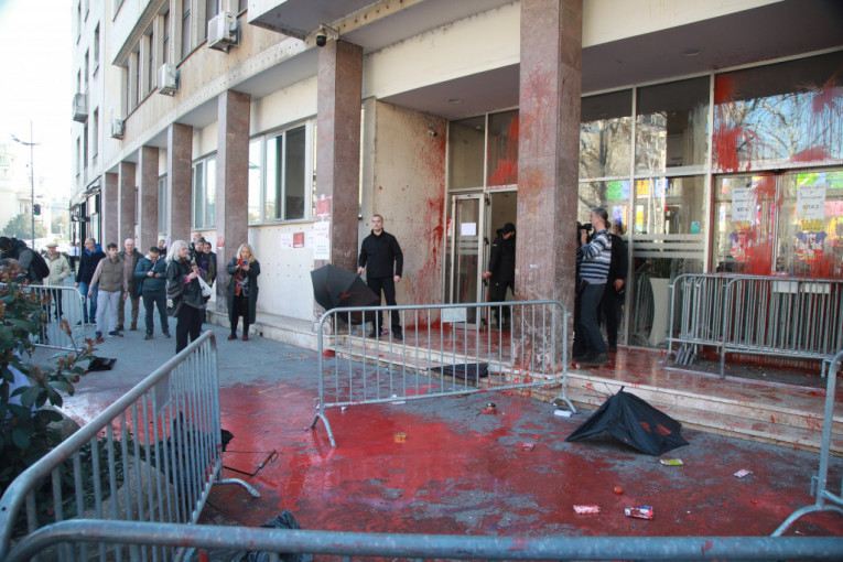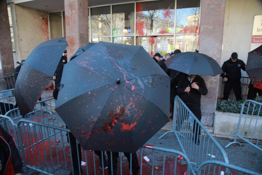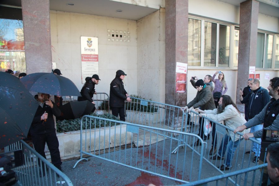 Okupljeni građani su prethodno ispred Skupštine grada gađali jajima i crvenom farbom zgradu gradske skupštine.