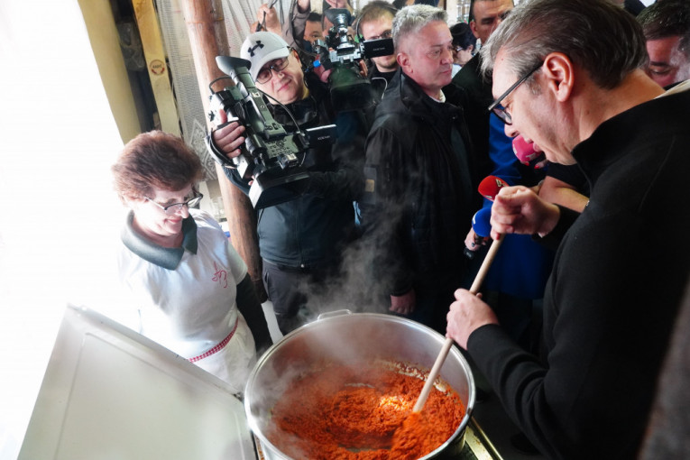 Radići su predsednika, čije gazdinstvo obilazi, dočekali svadbarskim kupusom koji su juče kuvali ceo dan jer im je velika želja već godinama bila da dočekaju predsednika u svom dvorištu i to svadbarskim kupusom.