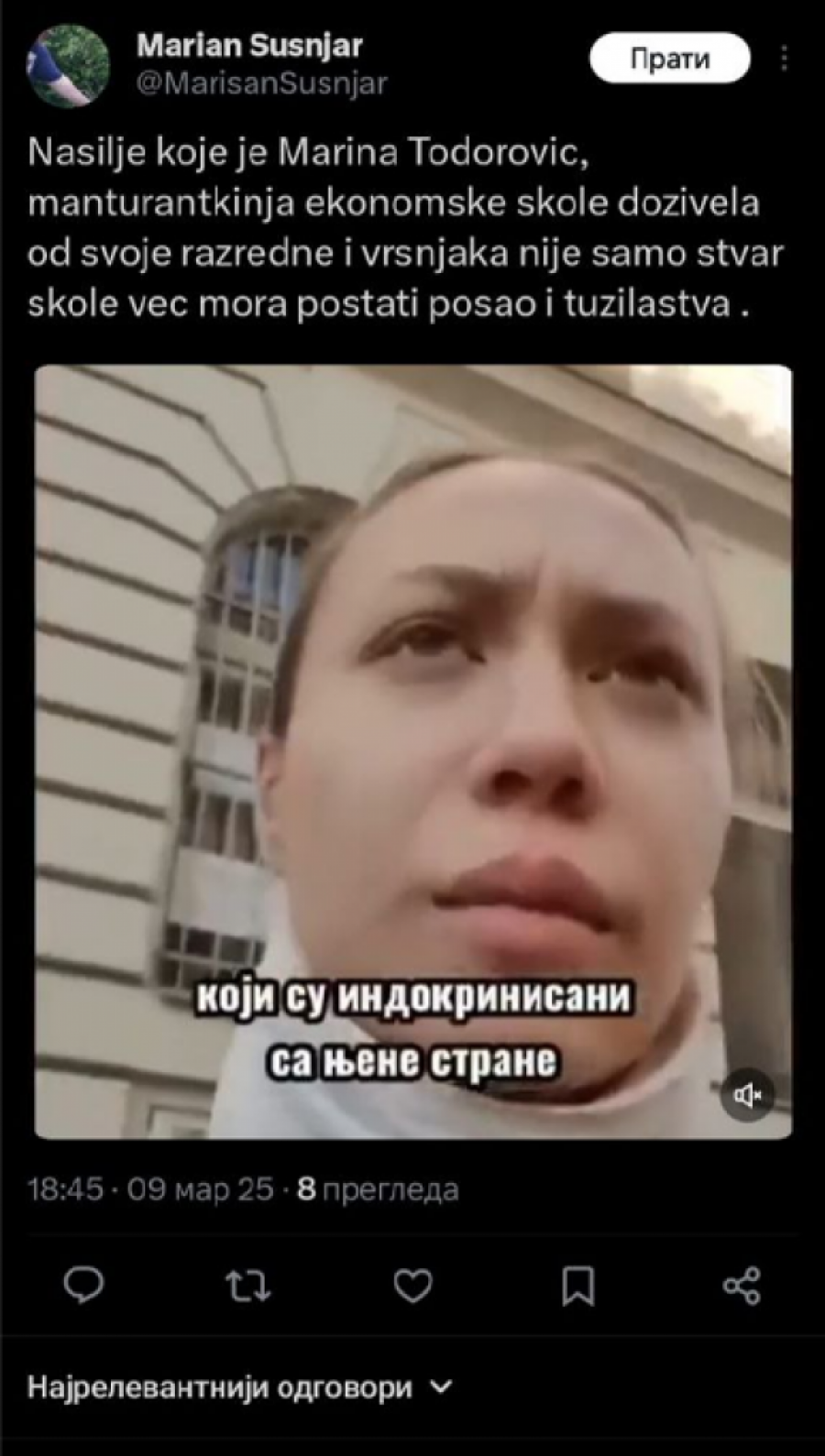 - Nasilje koje je Marina Todorović, maturantkinja Ekonomske škole, doživela od svoje razredne i vršnjaka nije samo stvar škole već mora postati i posao tužilaštva - glasio je jedan od komentara.