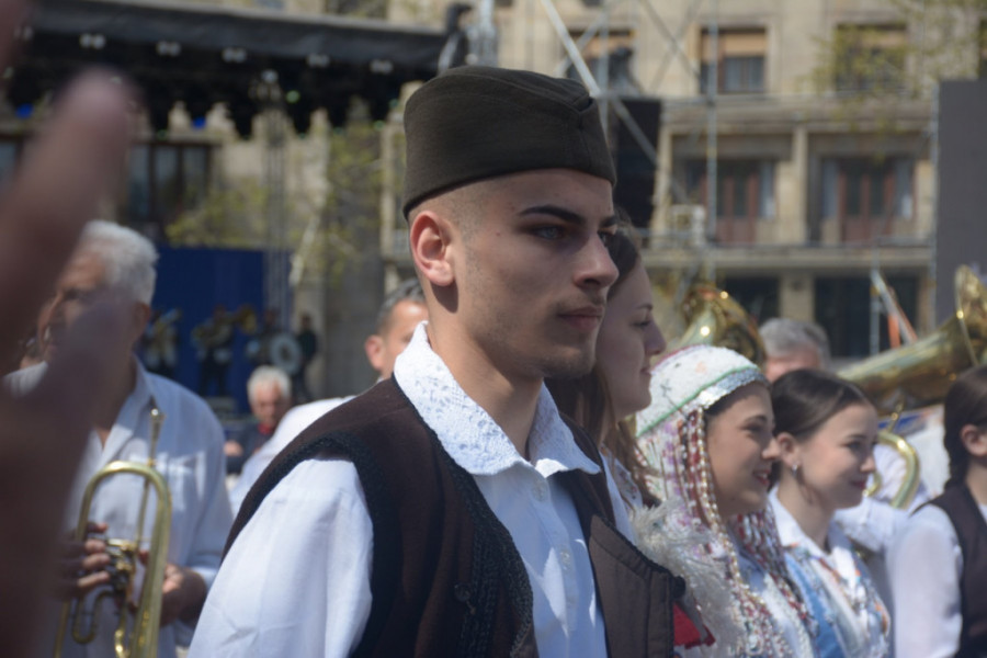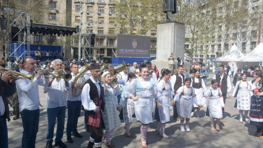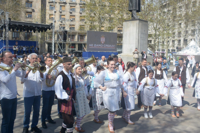 Građani uživaju u muzičkom programu ispred platoa Narodne skupštine, njih desetak je zaigralo kole, a tu su i mladi folkloraši u srpskim nošnjama!