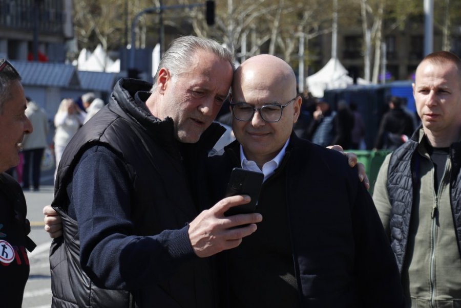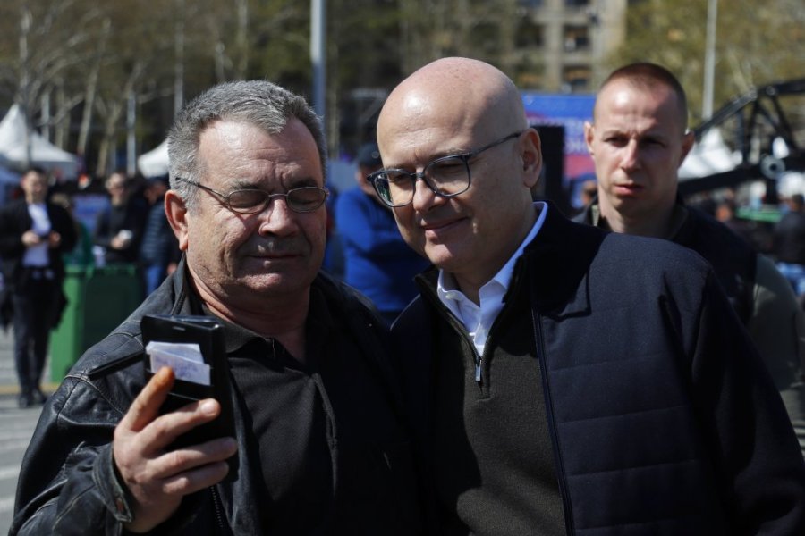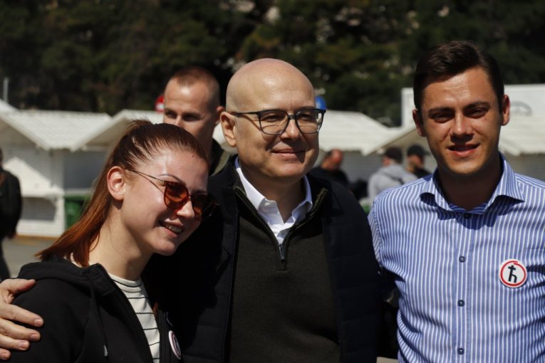 Predstavnici vlasti, sa širokim osmehom, nalazi se među masom i fotografišu se i razgovaraju sa građanima koji su se okupili na skupu.