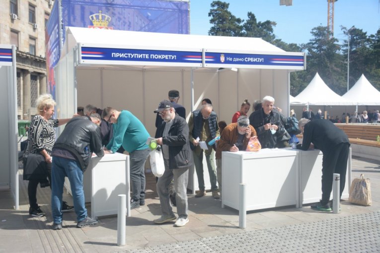Trećeg dana sabora "Ne damo Srbiju", na platou ispred Doma Narodne skupštine Srbije, građani mogu da se informišu o svenarodnom pokretu čije je formiranje inicirao predsednik Srbije Aleksandar Vučić, kao i da se učlane u taj pokret.