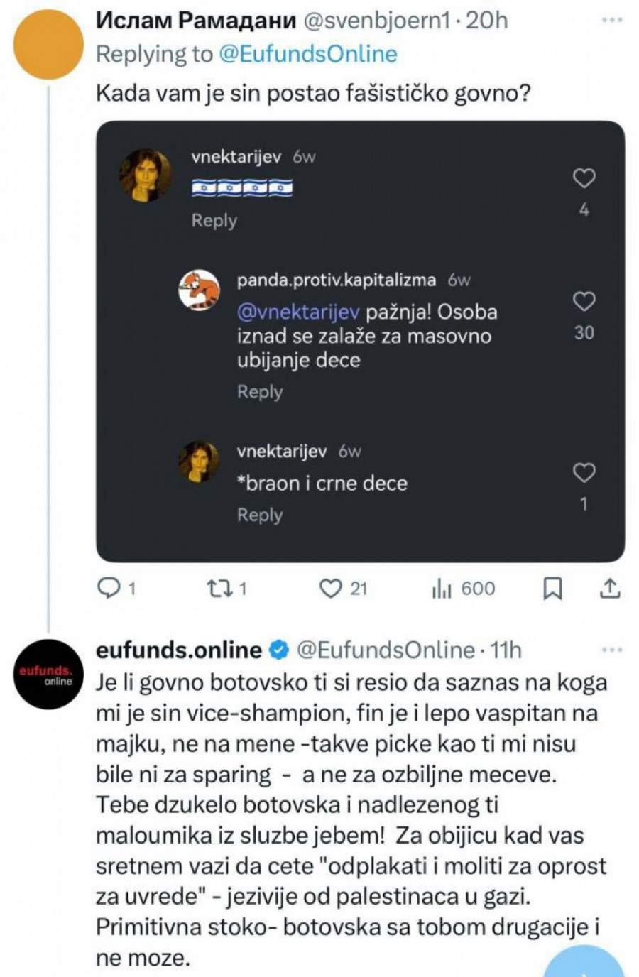 Njegovi stavovi, ako je suditi po onome što se može videti na mrežama, su toliko monstruozni i nazadni da bi se od njih postideo svaki normalan čovek. Student Nektarijević lajkuje i podržava silovanje žena, zagovara ubijanje dece u Gazi, psuje i vulgarno vređa svakoga ko drugačije misli... a za takvo ophođenje ima i podršku svog oca, barem onoga ko se po pseudonimom tako predstavlja na društvenim mrežama.