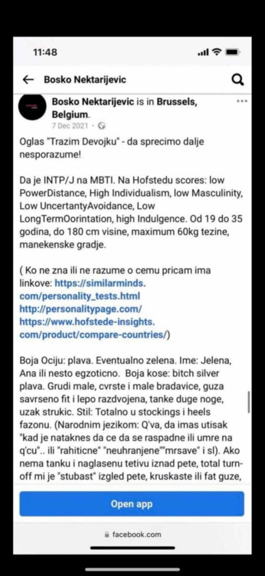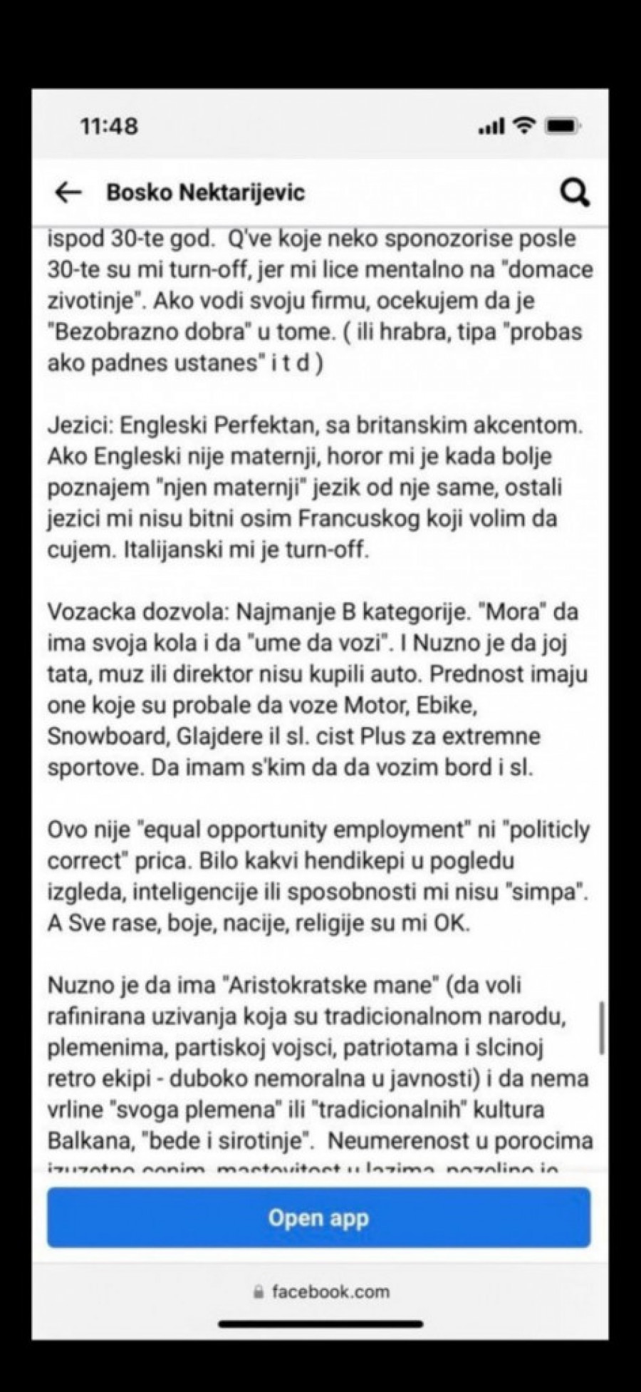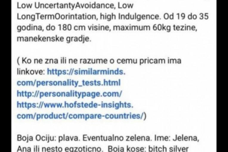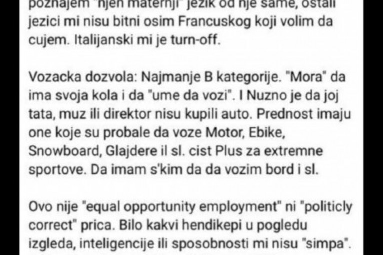 - Ovo nije "equal opportunity employment" ni "politicly correct" prica. Bilo kakvi hendikepi u pogledu izgleda, inteligencije ili sposobnosti mi nisu "simpa". A sve rase, boje, nacije, religije su mi ok. Nužno je da ima "Aristokratske mane" (da voli rafinirana uživanja koja su tradicionalnom narodu, plemenima, partiskoj vojsci, patriotama i sličnoj retro ekipi - duboko nemoralna u javnosti) i da nema vrline "svoga plemena" ili "tradicionalnih" kultura Balkana, "bede i sirotinje". Neumerenost u porocima izuzetno cenim - navodi se u ovom oglasu koji jasno pokazuje kakav ima stav prema ženama.