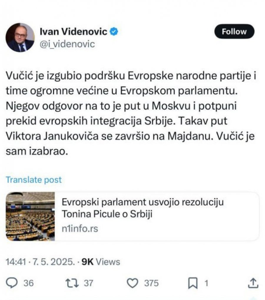 - Vučić je izgubio podršku Evropske narodne partije i time ogromne većine u Evropskom parlamentu. Njegov odgovor na to je put u Moskvu i potpuni prekid evropskih integracija Srbije. Takav put Viktora Janukoviča se završio na Majdanu. Vučić je sam izabrao - napisao je.