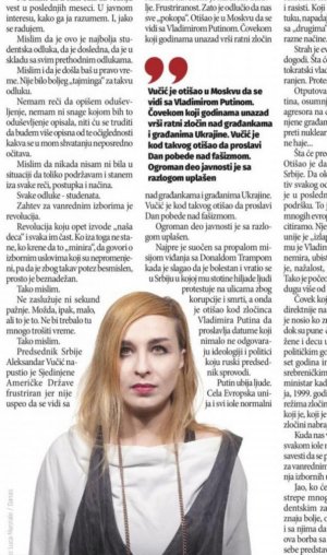 U pomenutom tekstu se Vučiću zamera što je otišao u Moskvu i sreo se sa ruskim predsednikom Vladimirom Putinom, kojeg nazivaju "ratnim zločincem".