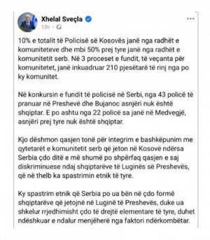 Lažni ministar unutrašnjih poslova u tehničkom mandatu, Dželjalj Svečlja, ponovio je sramne optužbe na račun Srba, tvrdeći da se Albanci navodno diskriminišu i da se vrši „etničko čišćenje "