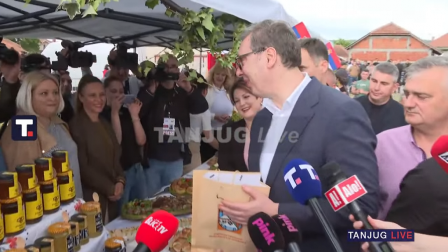Predsednika je dočekao veliki broj ljudi, uz srpske zastave i narodnu muziku, a na štandovima su izložili i svoje lokalne proizvode.