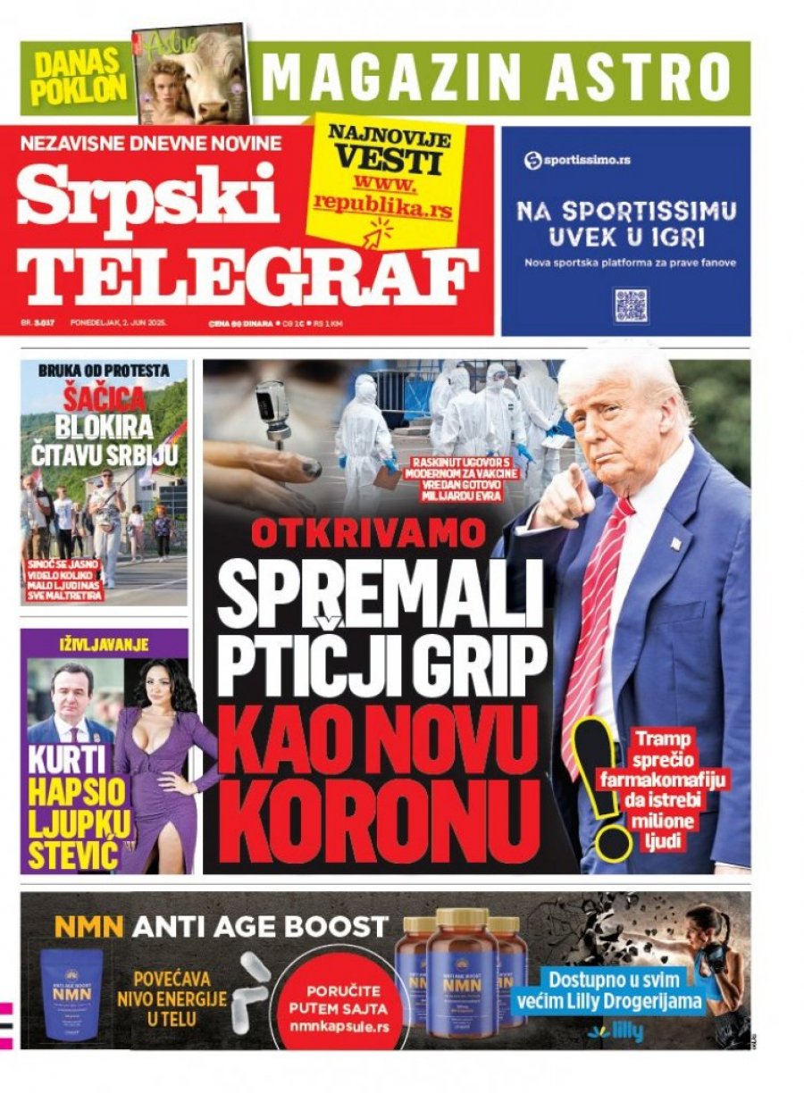 Današnje izdanje Srpskog telegrafa donosi nam pregršt zanimljivih priča iz svih oblasti ljudskog života - od našeg ASTRO dodatka, preko najvažnijih vesti iz domaće politike, hronike, ali i sveta, zabave, pa sve do sporta - uživanje u čitanju je zagarantovano, a ovo su samo neke priče iz današnjeg izdanja koje izdvajamo za vas: