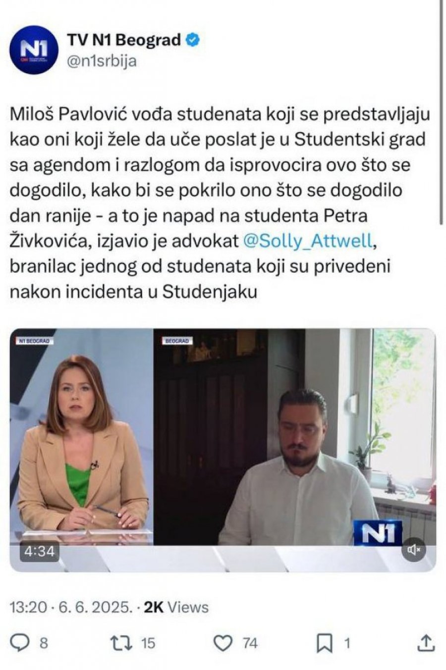 - Miloš Pavlović vođa studenata koji se predstavljaju kao oni koji žele da uče poslat u Studentski grad sa agendom i razlogom da isprovocira ovo što se dogodilo, kako bi se pokrilo ono što se dogodilo dan ranije - a to je napad na studenta Petra Živkovića, izjavio je advokat Jovan Rajić, branilac jednog od studenata koji su privedeni nakon incidenta u Studenjaku - objavljeno je na društvenoj mreži X.