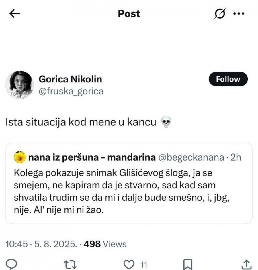 Blokaderska novinarka iz Novog Sada, na mreži X je stavila mrtvačku glavu i želi da Darko Glišić umre.