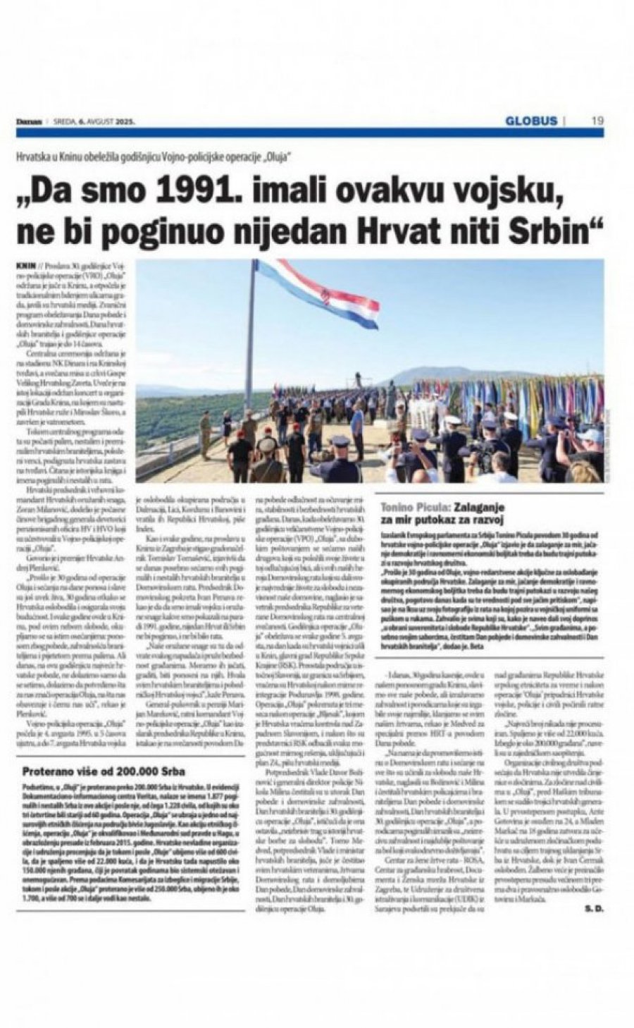 - Da smo 1991. imali ovakvu vojsku, ne bi poginuo nijedan Hrvat niti Srbin - piše Danas u vezi s vojnim mimohodom povodom zločinačke akcije "Oluja", koji su organizovale hrvatske vlasti.