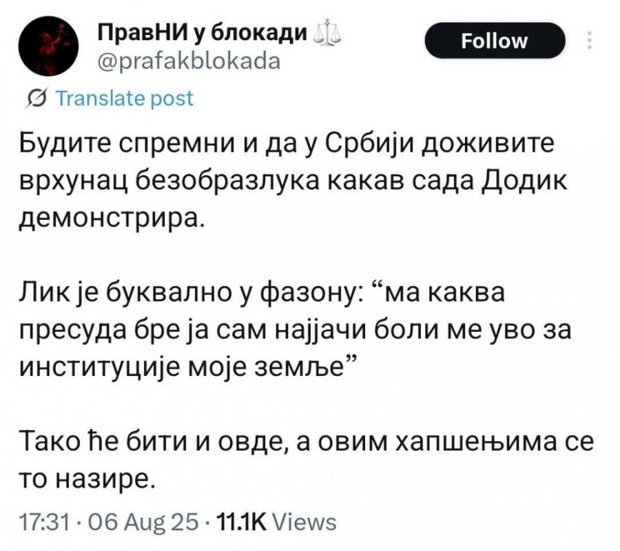 - Budite spremni i da u Srbiji doživite vrhunac bezobrazluka kakav sada Dodik demonstrira. Lik je bukvalno u fazonu: 'ma kakva presuda bre, ja sam najjači, boli me uvo i za institucije moje zemlje.' Tako će biti i ovde, a ovim hapšenjem se to i nazire" - pisalo je u jezivom postu!
