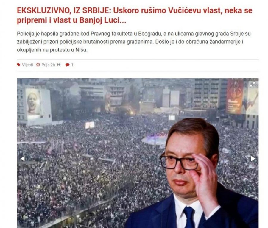Na navedenom portalu objavljen je tekst sa naslovom: "Ekskluzivno, iz Srbije: Uskoro rušimo Vučićevu vlast, neka se pripremi vlast u Banjoj Luci...". Na osnovu ovog se ponovo zaključuje da zemljama iz regiona, kao i blokaderima, ne odgovara jaka Srbija i snažan srpski narod.