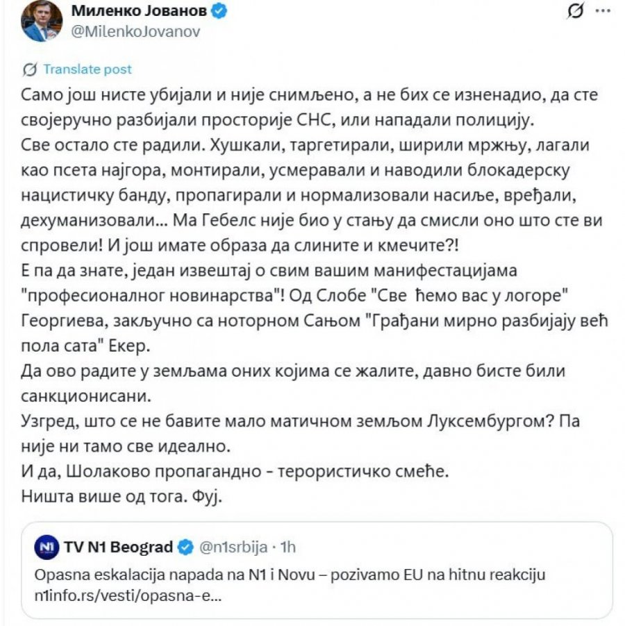 HUŠKALI STE, TARGETIRALI I ŠIRILI MRŽNJU! Milenko Jovanov oštro reagovao na zahtev Nove S i N1 da ih "zaštiti" Evropska unija od navodnih napada!