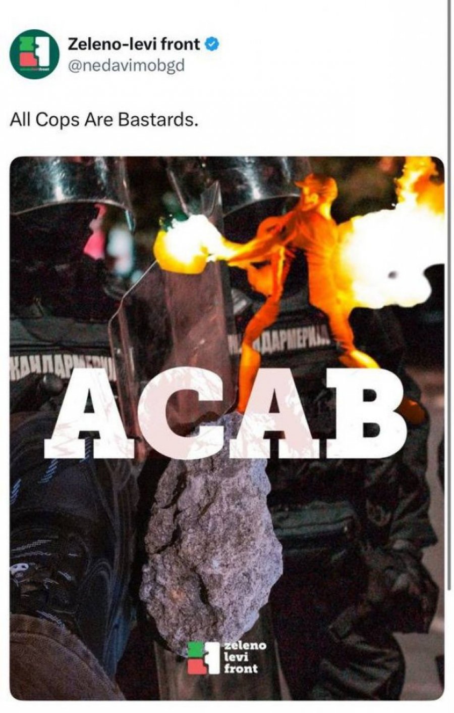 Takođe to ne zanima ni većinu pripadnika opozicije što dokazuje objava koju je postavio Zeleno-levi front na društvenoj mreži X. Objavljena je fotografija pripadnika žandarmerije u Srbiji, a preko nje je napisana skraćenica ACAB.