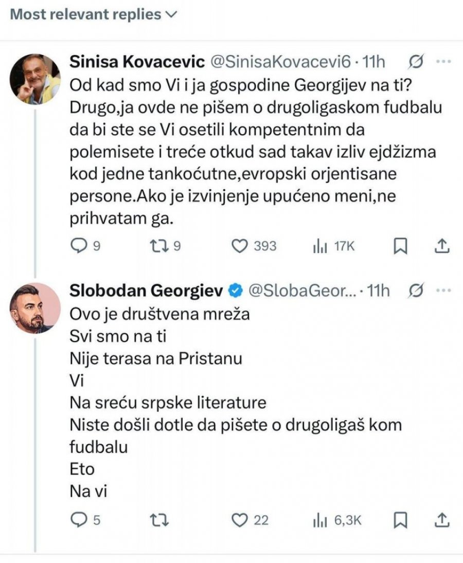 Opozicioni novinar Slobodan Georgiev i književnik, koga opozicija gura u prvi red kao svoju perjanicu i uzdanicu, Siniša Kovačević, ušli su u otvoreni rat na društvenoj mreži X.