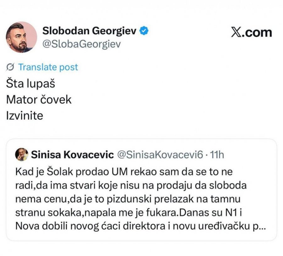 - Kad je Šolak prodao UM rekao sam da se to ne radi, da ima stvari koje nisu na prodaju, da sloboda nema cenu, da je p***i prelazak na tamnu stranu sokaka, napala me je fukara. Danas su N1 i Nova dobile novog ćaci direktora i novu uređivačku politiku - napisao je Kovačević na mrežama.