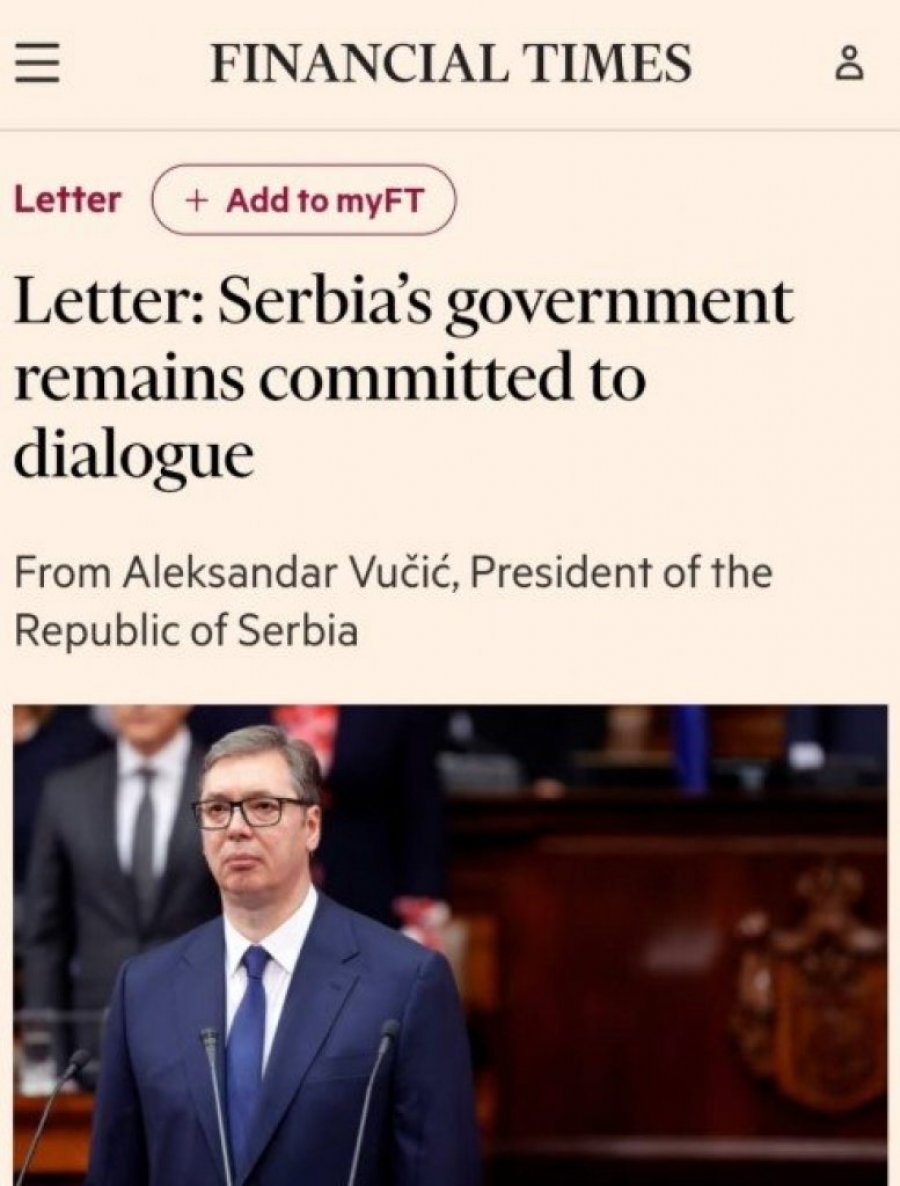 Pismo "Vlada Srbije ostaje posvećena dijalogu" od Aleksandra Vučića, predsednika Republike Srbije, objavljeno u Fajnenšel tajmsu, prenosimo vam u nastavku: