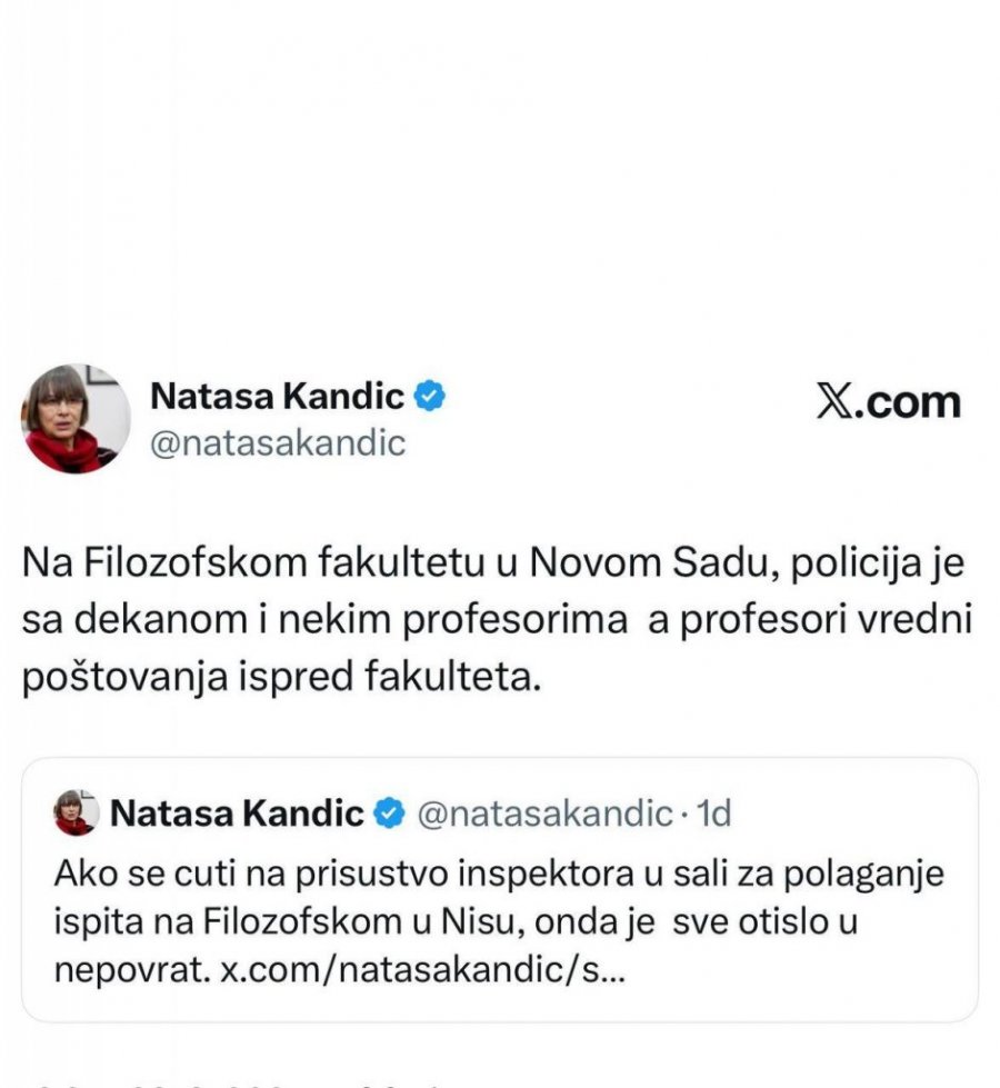 - Na Filozofskom fakultetu u Novom Sadu, policija je sa dekanom i nekim profesorima, a profesori vredni poštovanja ispred fakulteta - napisala je Kandić.