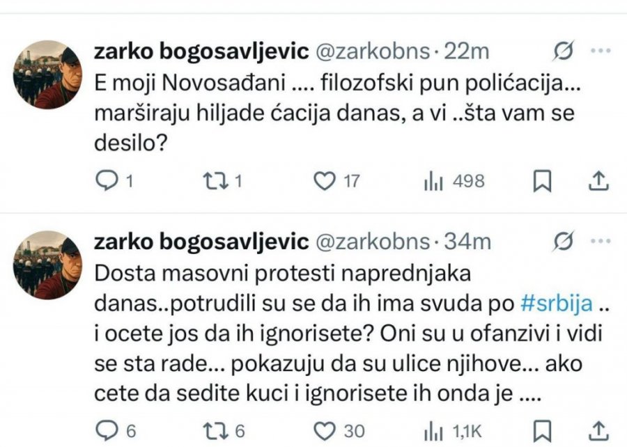 - Dosta masovni protesti naprednjaka danas...potrudili su se da ih ima svuda po Srbiji i hoćete jos da ih ignorišete? Oni su u ofanzivi i vidi se šta rade... pokazuju da su ulice njihove... ako ćete da sedite kući i ignorišete ih... - napisao je Bogosavljević.
