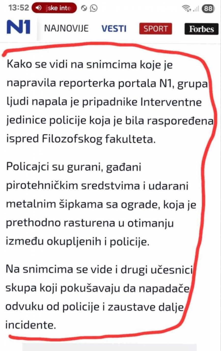 - Veb-reporterka N1 koja je u petak uveče pratila događaje u Novom Sadu zabeležila je incidente ispred Filozofskog fakulteta u Novom Sadu, posle kojih je usledila akcija policije i rasturanje skupa koji je do tada proticao mirno. Kako se vidi na snimcima koje je napravila reporterka portala N1, grupa ljudi napala je pripadnike Interventne jedinice policije koja je bila raspoređena ispred Filozofskog fakulteta. Policajci su gurani, gađani pirotehničkim sredstvima i udarani metalnim šipkama s ograde, koja je prethodno rasturena u otimanju između okupljenih i policije - navodi se u izveštaju na portalu N1.
