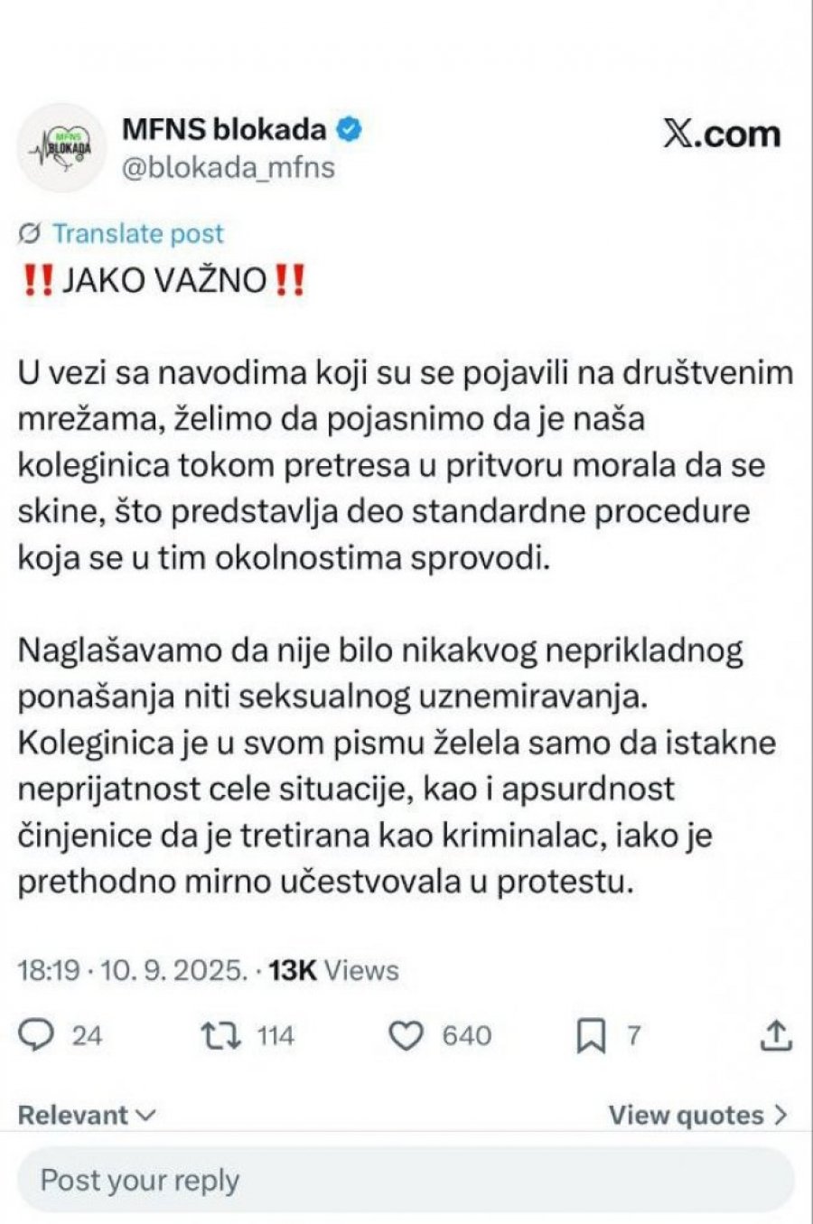 – U vezi sa navodima koji su se pojavili na društvenim mrežama, želimo da pojasnimo da je naša koleginica tokom pretresa u pritvoru morala da se skine, što predstavlja deo standardne procedure. Naglašavamo da nije bilo nikakvog neprikladnog ponašanja niti seksualnog uznemiravanja. Koleginica je u svom pismu želela samo da istakne neprijatnost cele situacije, kao i apsurdnost činjenice da je tretirana kao kriminalac, iako je prethodno mirno učestvovala u protestu – naveli su studenti na zvaničnom nalogu.
