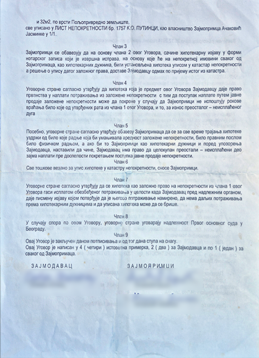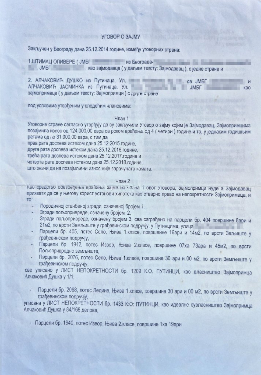 A u ugovoru je bilo navedeno da su 25. 12. 2014. primili na zajam 124.000 evra od Olivere Štimac i da je njihova obaveza da ga vrate u četiri jednake rate od po 31.000 evra u roku od četiri godine, zaključno s 25. 12. 2018. Sve to, iako je uzeto samo 100.000.