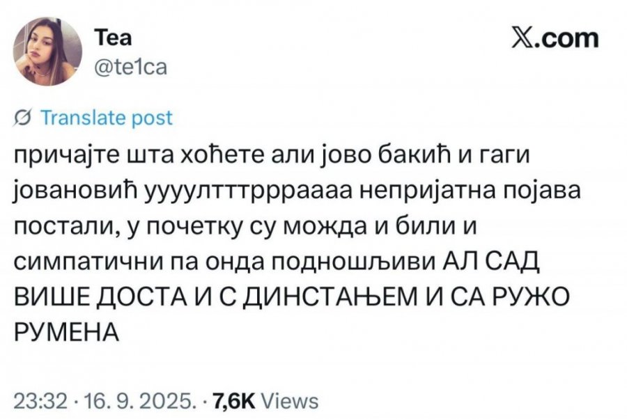 - Pričajte šta hoćete, ali Jovo Bakić i Gagi Jovanović ultra neprijatna pojava postali. U početku su možda i bili simpatični pa onda podnošljivi, ali sad više dosta i s dinstanjem i sa ružo rumena