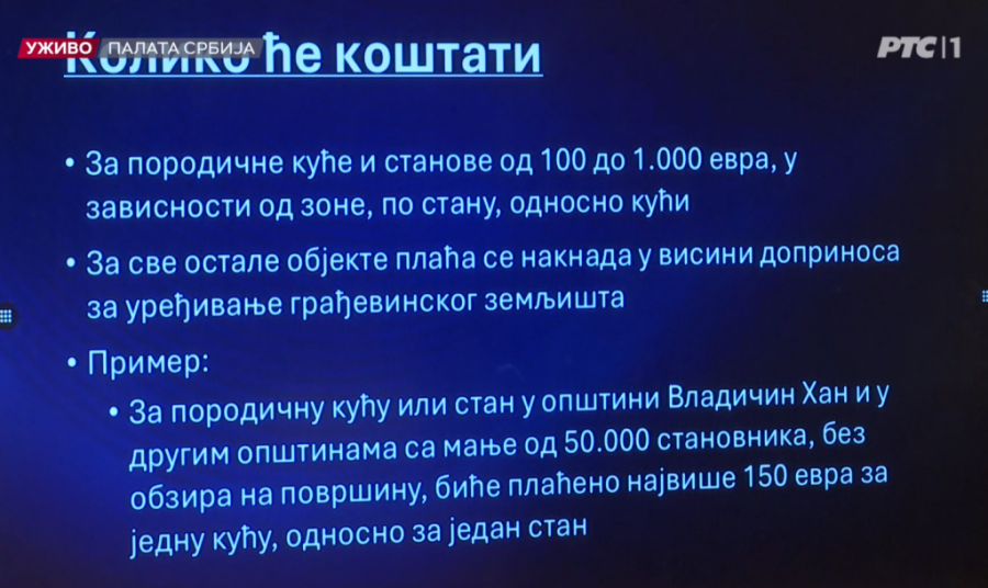 - To je neverovatno za građane. Naša ideja je da prostom prijavom u digitalnoj formi evidentiramo sve objekte. Elektronsku prijavu pošaljete samo prijavu, biće utvrđeno do nove godine, pošaljete u opštinu, jedan običan papir. I vi do nove godine u roku od 60 dana imate svoj legalan objekat, u potpunosti. Kompletan objekat platite 100 evra legalizaciju. A najskuplje će biti stan na Terazijama 200 kvadrata, za to platite 1000 evra. To je najskuplje. I stan postane legalan - rekao je predsednik.