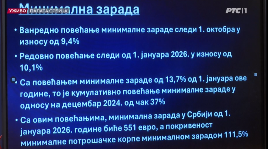 - Po prvi put u istoriji Srbije imaćemo minimalnu pokrivenost potrošačke korpe ne od 100 odsto, nego 111 odsto. To pokazuje koliko će ljudi lakše da žive - rekao je Vučić.