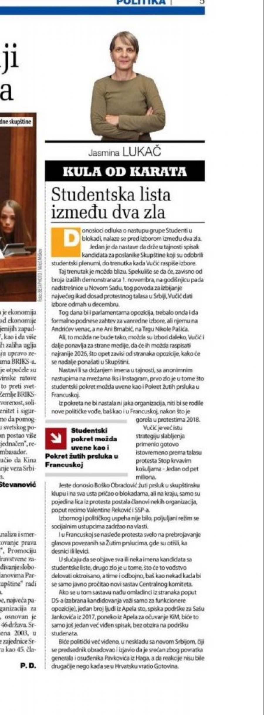 U toj kolumni pod naslovom "Studentska lista između dva zla" ova novinarka, poznata po simpatijama prema Draganu Đilasu, žestoko je udarila na blokadere i uporedila ih sa pokretom Žutih prsluka u Francuskoj.