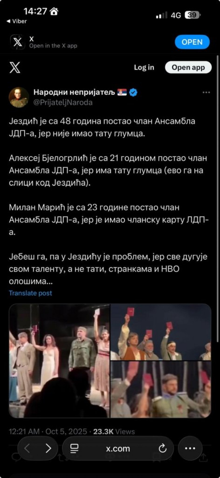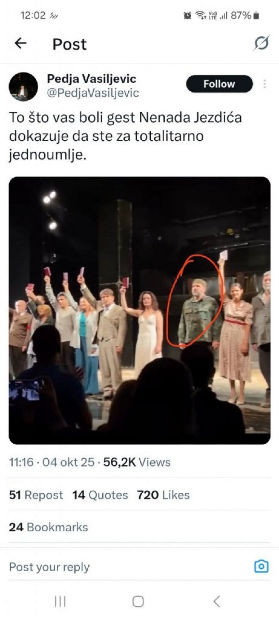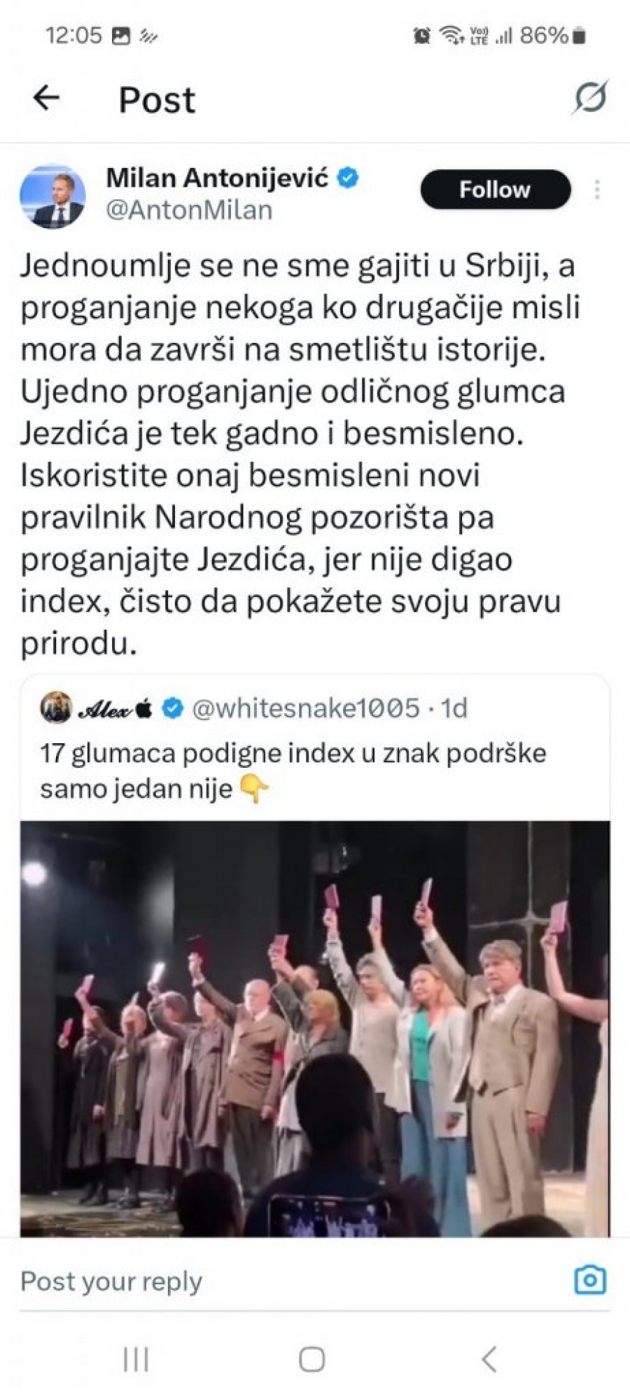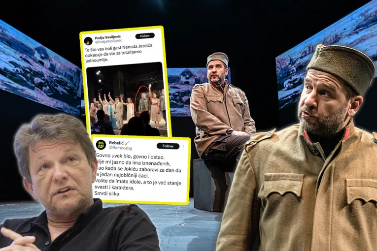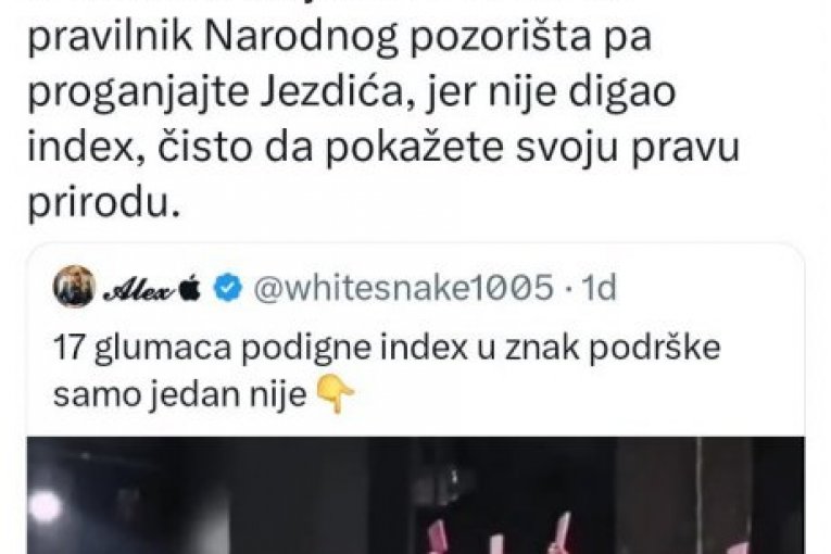 - Jednoumlje se ne sme gajiti u Srbiji, a proganjanje nekoga ko misli drugačije mora završiti na smetlištu istorije. Progon vrhunskog glumca poput Jezdića je posebno gadna i besmislena stvar. Ako već imate taj vaš besmisleni pravilnik Narodnog pozorišta, hajde proganjajte i Jezdića jer nije digao indeks, čisto da pokažete svoju pravu prirodu - napisao je Antonijević na Tviteru, uz snimak sa kraja predstave.