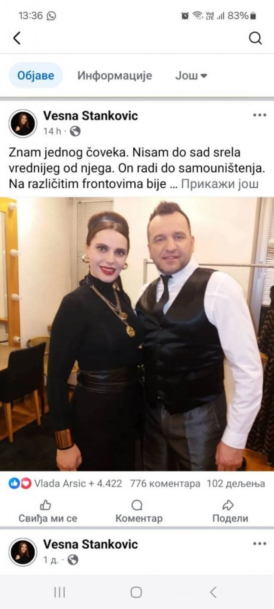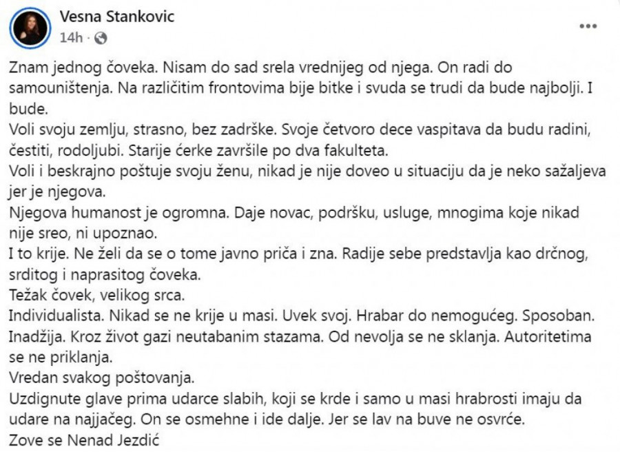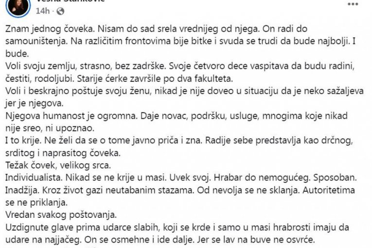- Znam jednog čoveka. Nisam do sad srela vrednijeg od njega. On radi do samouništenja. Na različitim frontovima bije bitke i svuda se trudi da bude najbolji. I bude. Voli svoju zemlju, strasno, bez zadrške. Svoje četvoro dece vaspitava da budu radini, čestiti, rodoljubi. Starije ćerke završile po dva fakulteta. Voli i beskrajno poštuje svoju ženu, nikad je nije doveo u situaciju da je neko sažaljeva jer je njegova. Njegova humanost je ogromna. Daje novac, podršku, usluge, mnogima koje nikad nije sreo, ni upoznao. I to krije. Ne želi da se o tome javno priča i zna - napisala je Vesna na Fejsbuku uz njihovu zajedničku sliku i dodala: