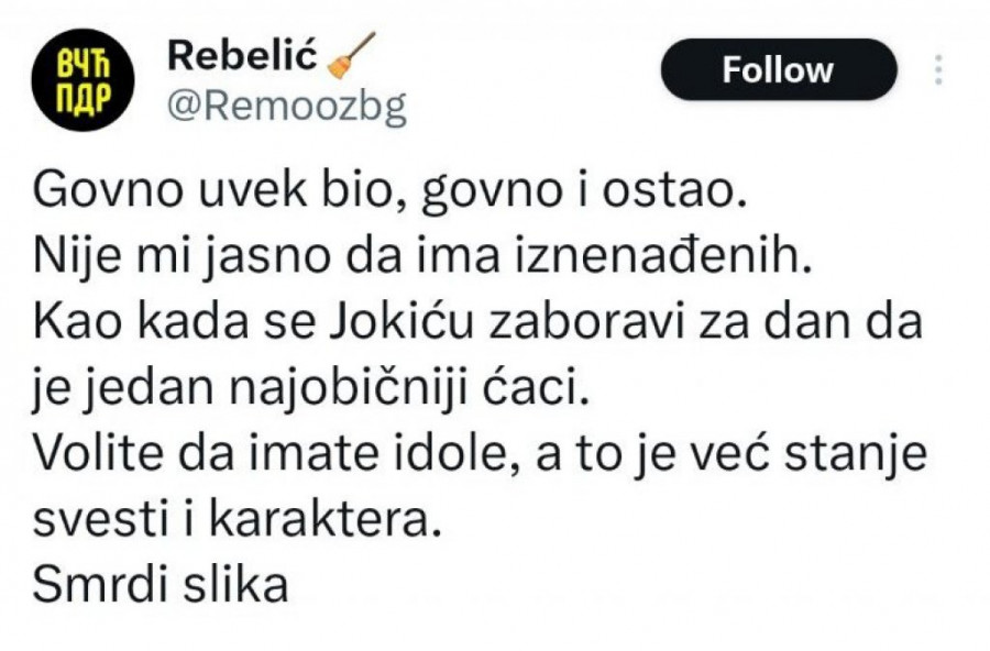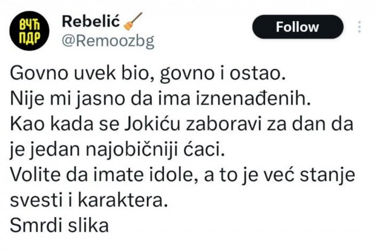 - Govno uvek bio, govno i ostao. Nije mi jasno da ima iznenađenih. Kao kada se Jokiću zaboravi za dan da je jedan najobičniji ćaci. Volite da imate idole, a to je već stanje svesti i karaktera. Smrdi slika - napisao je on uz fotografiju Jezdića, na šta mu je odgovorio Peđa Vasiljević: